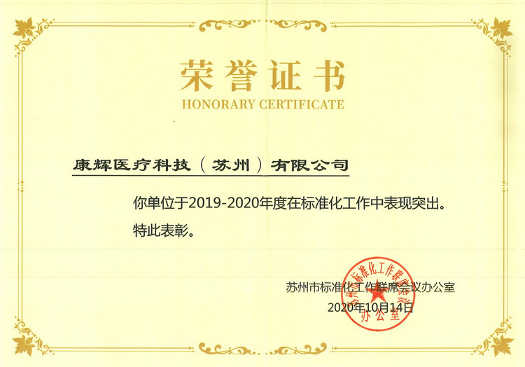 蘇州市標(biāo)準(zhǔn)化頒發(fā)“榮譽證書”