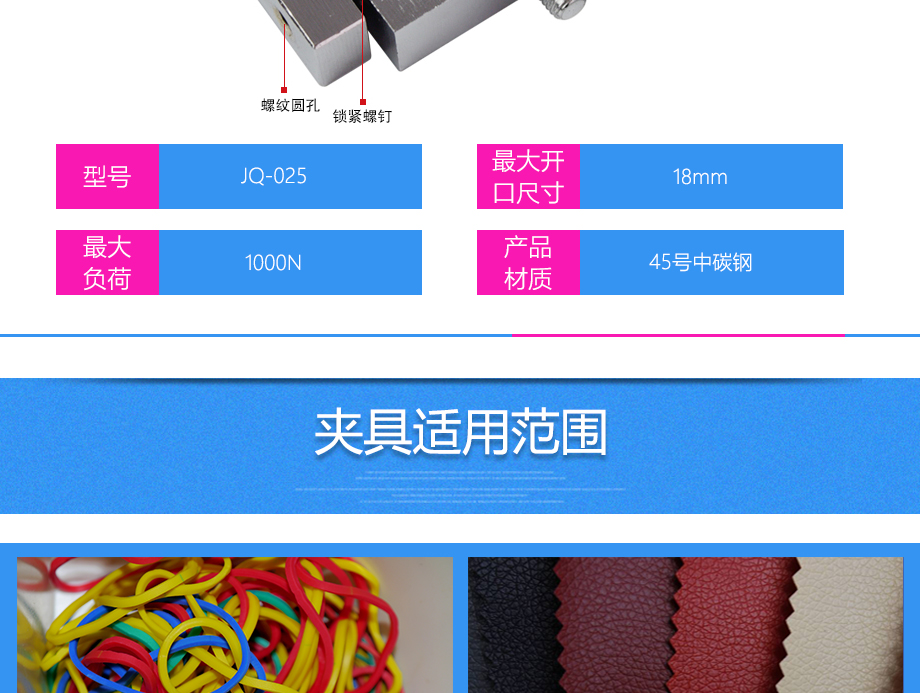 產品型號:JQ-025 品牌:劍 喬 用途:尖口端子夾具適用范圍:橡膠、各種線纜、紙、各種電器元件、塑料薄膜等材料的拉力,破壞力測試。