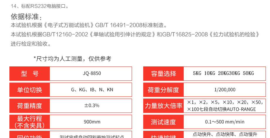 產品型號:JQ-8850 品牌:劍 喬 用途:本系列機廣泛用于各類薄膜、五金、橡膠料、紡織、建材、絕緣體、電線、電纜、端子等各類材料。測試其拉伸、撕裂、穿刺、剝離、抗壓、彎曲、抗剪切、定荷重、定位移、三點抗折